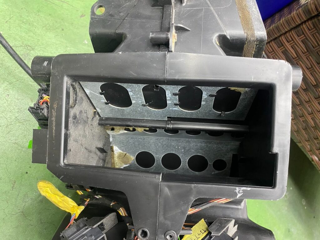 986ボクスターのエアコン内部には、冷風・温風を切り替えるための**フラップ(仕切り板)**があります。このフラップには、構造上大きな穴が開いており、スポンジはその穴を塞ぐ役割をしています。